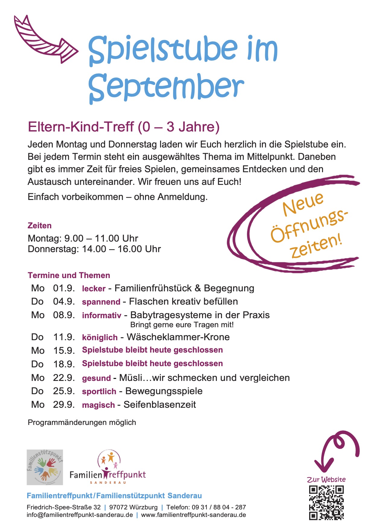 Seine Aufgabe ist es, Familien im Stadtteil zu unterstützen und durch verschiedene Angebote zu entlasten. Der Familientreffpunkt steht allen Familien mit Kindern offen und organisiert zahlreiche niedrigschwellige Angebote. Eine weitere wichtige Funktion des Familientreffpunkts Sanderau ist die Vernetzung mit anderen Einrichtungen im Stadtteil.